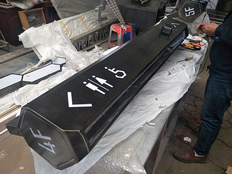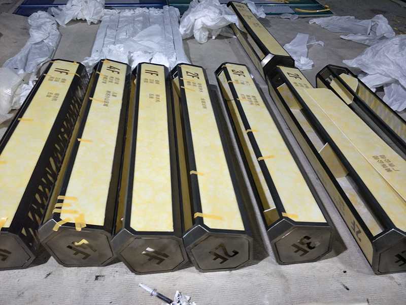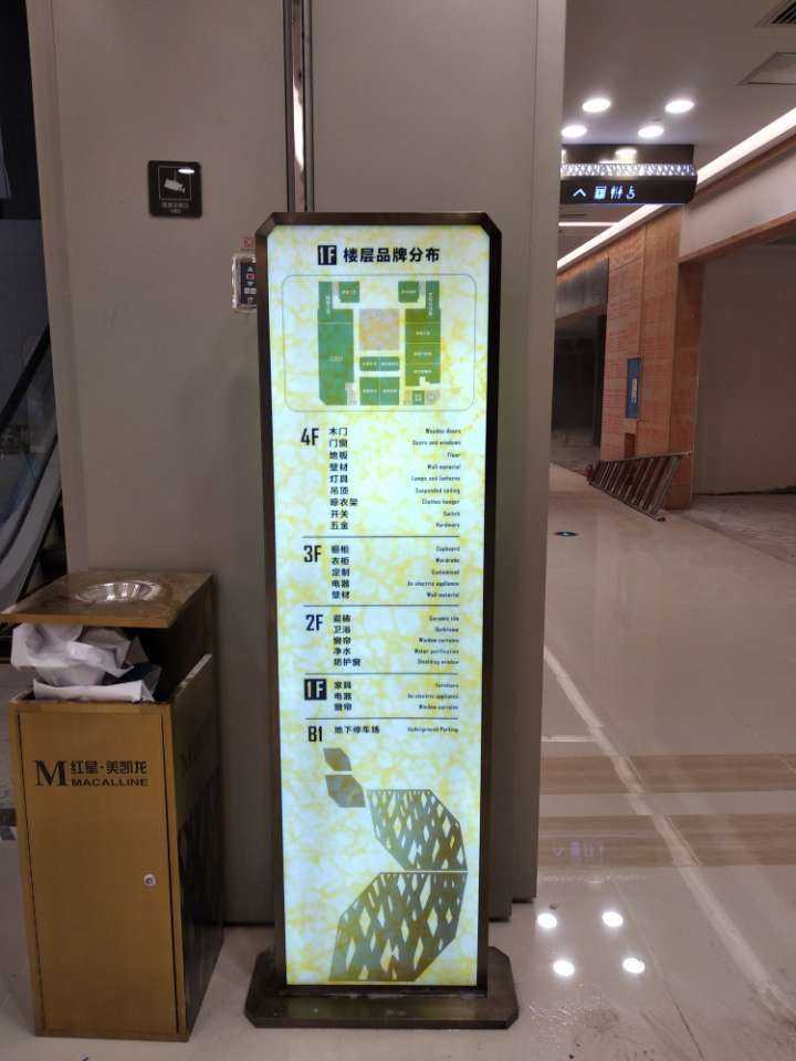 本批次產(chǎn)品均由不銹鋼折彎焊接成型, 表面采用電鍍上色,吊牌內(nèi)容鏤空,內(nèi)襯亞克力,LED發(fā)光。整體從內(nèi)部機構(gòu)到外表造型及顏色均滿足紅星美凱龍總部要求的VI標(biāo)準(zhǔn),與商場環(huán)境和風(fēng)格相互融合,滿足導(dǎo)視功能的同時融入環(huán)境,增強視覺美感。